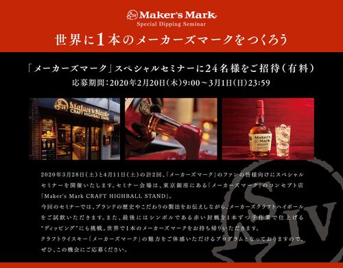 が3月28日(土)と4月11日(土)の計2日、各日2回東京・銀座の「Maker`s Mark CRAFT HIGHBALL STAND」にて開催されるそうです。 因みにセミナーは3,000円と有料ですが、メーカーズマークの歴史やこだわりの製法を学びながらメーカーズマーク・クラフトハイボール…